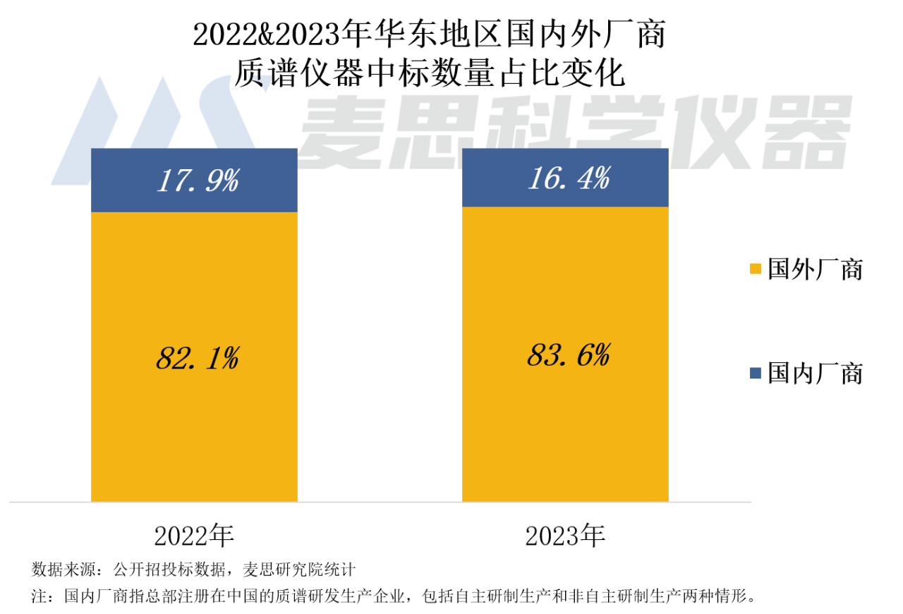 2023年華東地區國內廠商中標數量占比為16.4%,同比下降1.5個百分點。國外廠商中標數量占比為83.6%,高于全國市場平均值(76%),占據市場主導地位。從二者占比變化可見,2023年國內廠商的質譜儀器中標數量下降幅度高于國外廠商。