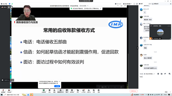授課直播間氛圍熱烈,學員與授課老師頻頻互動交流,咨詢在業務開展中實際糾紛的化解策略。授課老師針對賬款催收中訴訟手段和非訴訟手段的適用場景進行細致解答。學員紛紛表示,培訓內容切中企業痛點,突出應收賬款催收技巧實效性,有助于提高企業運營效率,降低壞賬風險。