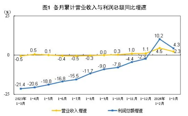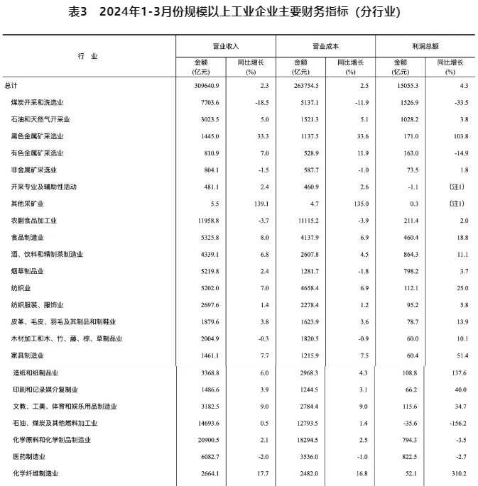 1-3月份,規(guī)模以上工業(yè)企業(yè)實(shí)現(xiàn)營業(yè)收入30.96萬億元,同比增長2.3%;發(fā)生營業(yè)成本26.38萬億元,增長2.5%;營業(yè)收入利潤率為4.86%,同比提高0.09個(gè)百分點(diǎn)。