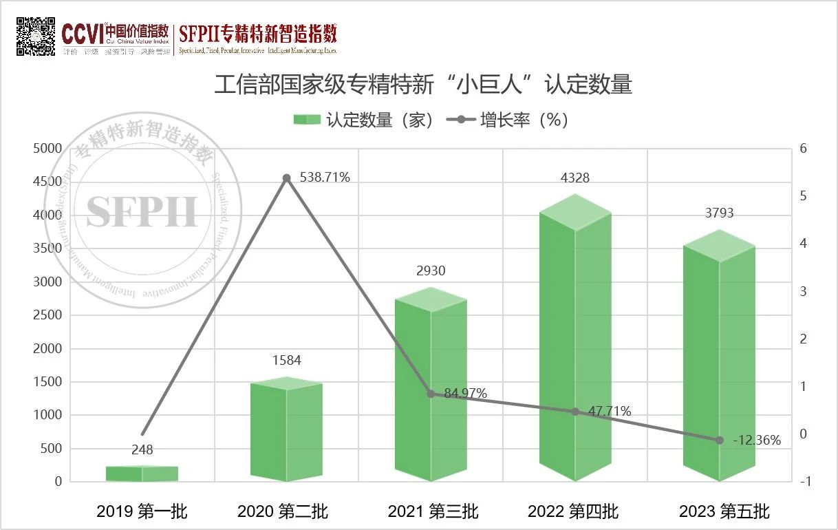 據(jù)SFPII專精特新智造指數(shù)跟蹤顯示,2023年工信部第五批國家級專精特新“小巨人”企業(yè)認(rèn)定共計3793家,該批申請數(shù)量創(chuàng)歷史新高,合計約17000家,但是通過率創(chuàng)歷史新低,約22.3%。截至2023年底,全國共有12756家“專精特新”小巨人企業(yè),提前并超額完成了“到2025年,培育1萬家國家級專精特新‘小巨人’企業(yè)”的目標(biāo)”。
