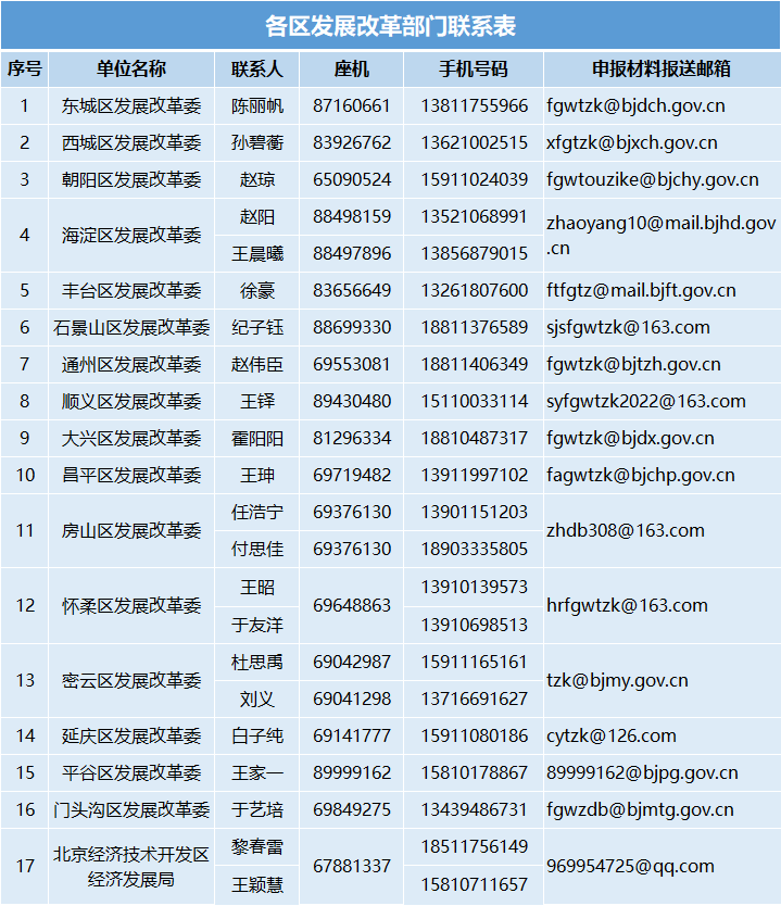 請(qǐng)于5月20日前向區(qū)發(fā)展改革部門申報(bào)(可為項(xiàng)目所在地或項(xiàng)目單位注冊(cè)地所在區(qū)發(fā)展改革部門)。此次項(xiàng)目征集還梳理了各區(qū)發(fā)展改革部門聯(lián)絡(luò)員的聯(lián)系方式、申報(bào)郵箱,歡迎有需要的企業(yè)就近就便咨詢政策。