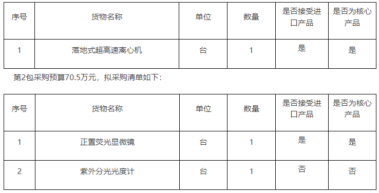 華中師范大學落地式超高速離心機、正置熒光顯微鏡、紫外分光光度計儀器設備采購,本項目劃分為2個包,第1包采購預算77萬元,擬采購清單如下: