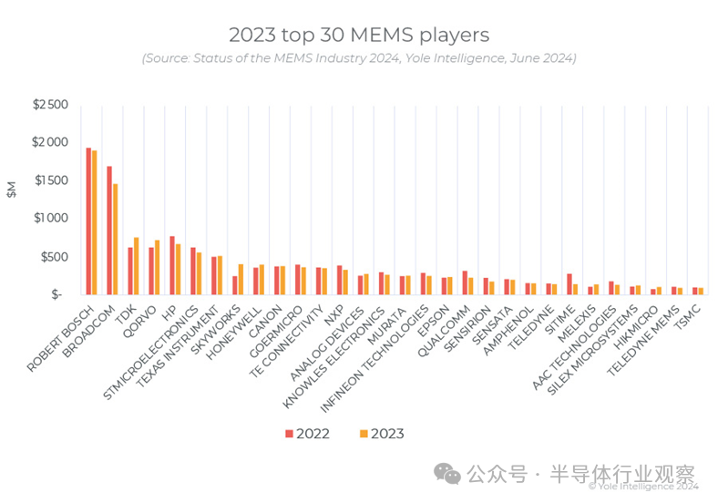 從廠商來看,博世、意法半導體和 TDK 三巨頭繼續(xù)領(lǐng)跑 MEMS 傳感器市場,而博通和 Qorvo 則領(lǐng)跑 RF MEMS 市場。博世保持相對穩(wěn)定的營收,而 TDK 的增長速度超過市場,抵消了意法半導體的下滑。博通在蘋果的 FBAR 業(yè)務(wù)中失去了很大一部分份額,而 Qorvo 憑借其 BAW SMR 奪回了一部分業(yè)務(wù)。