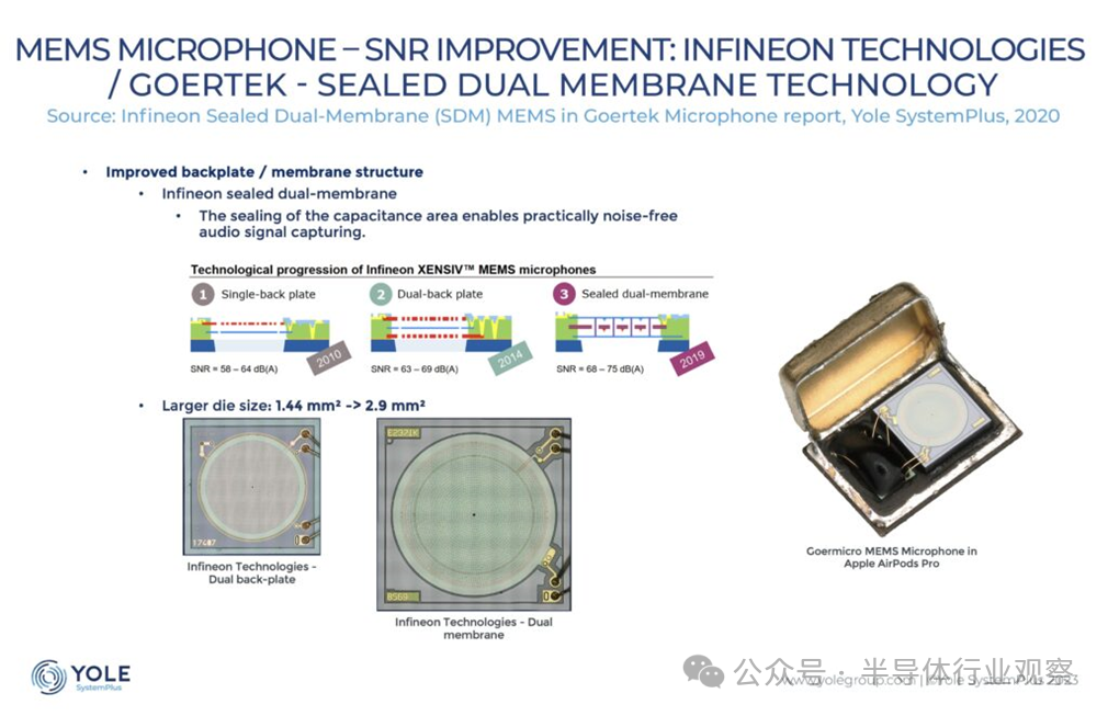 從設(shè)計和材料角度來看,MEMS 廠商正在不斷創(chuàng)新,以提高其設(shè)備的性能。例如,英飛凌科技在蘋果 Airpods Pro 的歌爾 MEMS 麥克風中采用了密封雙膜技術(shù),顯著提高了 SNR 性能。