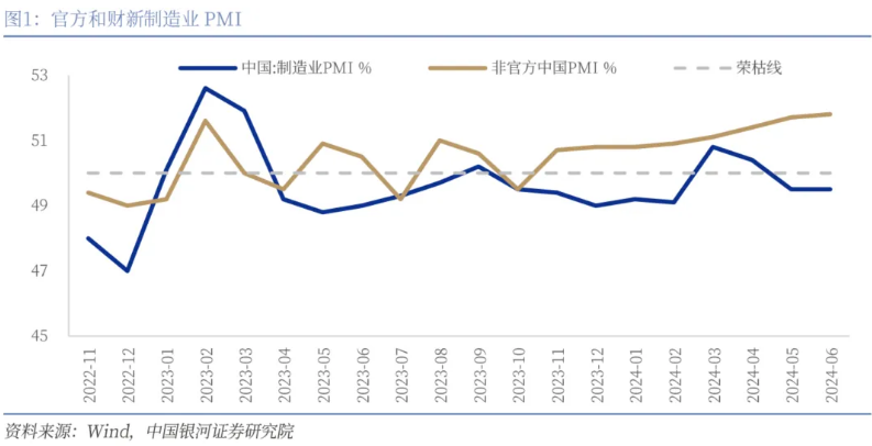 財新PMI再度上行,與中采PMI背離繼續(xù)走闊。7月1日,財新發(fā)布6月PMI錄得51.8%,環(huán)比上漲0.1pct,在擴張區(qū)間再次上行。財新PMI在2023年11月以來持續(xù)強勢,連續(xù)8個月保持擴張。但與此同時官方制造業(yè)PMI和財新PMI卻持續(xù)背離,這8個月期間官方制造業(yè)PMI平均為49.61%,而財新PMI均值為51.15%,且背離幅度有走闊趨勢。