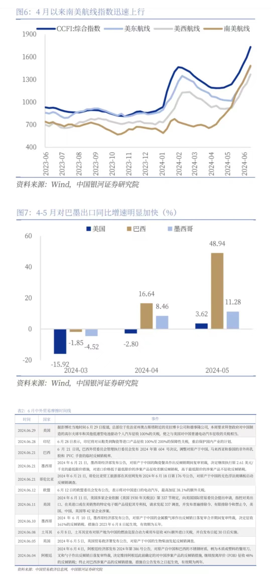 受制于進口國貿(mào)易政策的變化和地緣政治的潛在影響,企業(yè)出現(xiàn)搶出口行為。5月14日美方發(fā)布對華加征301關稅四年期復審結(jié)果,進一步提高對自華進口的電動汽車等約180億美元商品加征關稅,6月以來歐盟、土耳其、巴西、印尼等也陸續(xù)宣布將對我國部分出口商品加征關稅。受此因素驅(qū)動,企業(yè)出現(xiàn)“搶出口”行為以規(guī)避高額關稅。5月份以來,CCFI指數(shù)迅速上漲,美西、美東、南美航線運價上漲尤其顯著。對外貿(mào)更加敏感的中小企業(yè)具有更顯著的搶出口效應,5月出口增速改善幅度顯著好于出口交貨值增速。