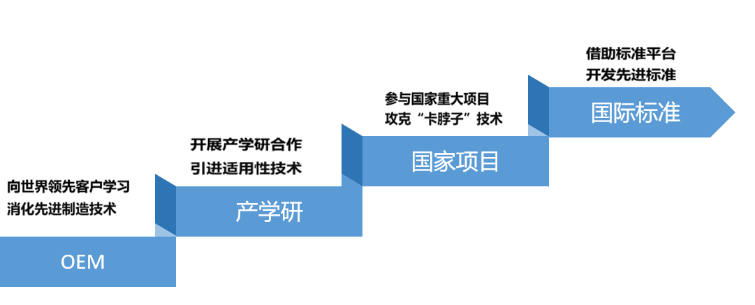 堅持高強度研發投入支持創新,近三年研發投入營收占比均超8%,2023年超10%。公司總結出階梯式科技資源整合創新路徑,從早期向領先客戶學習基本的生產工藝與產品設計知識,到與高校院所進行產學研合作學習新產品開發,再到參與國家重大工程進行研發學習來探索前沿技術?,F階段是借助標準平臺開發先進標準,在標準制定中學。