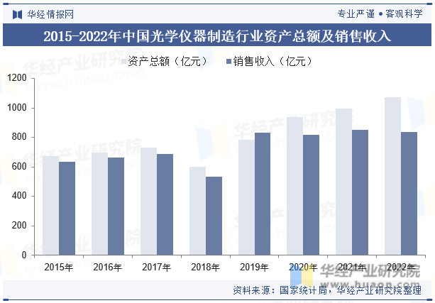 根據(jù)國家統(tǒng)計局數(shù)據(jù),近年來我國光學儀器制造行業(yè)資產總額及銷售收入總體呈現(xiàn)出增長態(tài)勢,2015-2022年,行業(yè)資產總額由674.99億元增長至1072.58億元,CAGR為6.84%,行業(yè)銷售收入由632.65億元增長至835.72,CAGR為4.06%。
