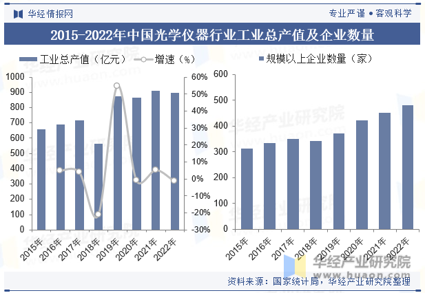 在電子技術和計算機行業(yè)發(fā)展的帶動下并伴隨著下游應用領域需求的日益增長,使得國內光學儀器制造行業(yè)市場規(guī)模持續(xù)擴張。據(jù)統(tǒng)計,2022年中國光學儀器制造行業(yè)工業(yè)總產值稍有下滑,為898.23億元,同比減少1.38%。我國光學儀器制造行業(yè)規(guī)模以上企業(yè)數(shù)量逐年攀升,2015年光學儀器制造行業(yè)規(guī)模以上企業(yè)數(shù)量為314家,2022年提升至482家。