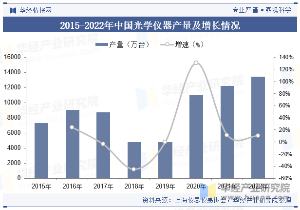 光學儀器是儀器儀表行業(yè)中非常重要的組成類別,從產量來看,近幾年國內光學儀器產量大幅增長,2020年中國光學儀器產量突破1億臺,同比增速達130.35%,2022年產量增長至1.35億臺,同比上漲10.05%。