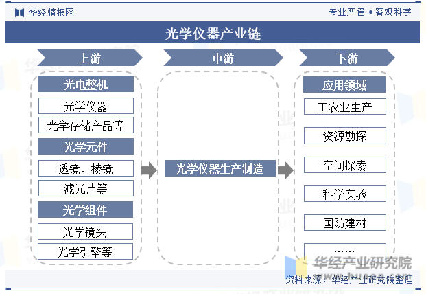 我國光學儀器行業(yè)產業(yè)鏈上游主要包括光電整機、光學元件以及光學組件供應商;中游為光學儀器生產制造環(huán)節(jié),下游應用領域廣泛,是工農業(yè)生產、資源勘探空間探索、科學實驗、國防建設以及社會生活各個領域不可缺少的觀察、測試分析、控制、記錄和傳遞的工具。