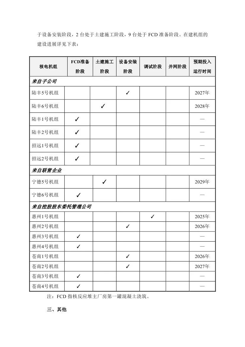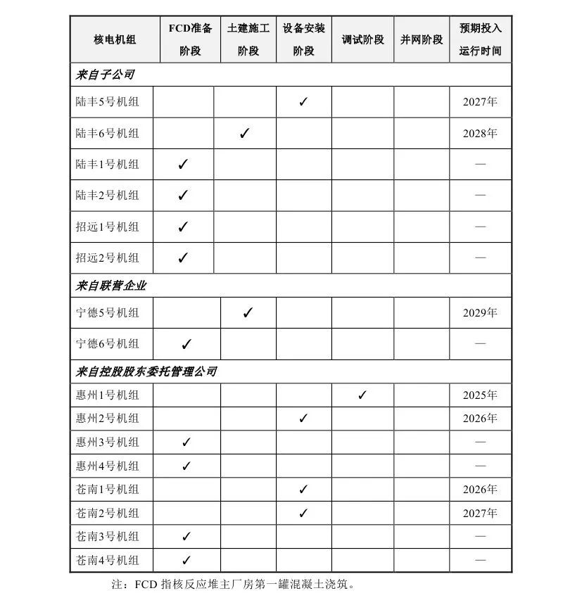 中國廣核表示,截至2024年9月30日,本集團共管理16臺已核準待FCD及在建核電機組(包括本公司控股股東委托本公司管理的8臺機組),1臺處于調(diào)試階段,4臺處于設(shè)備安裝階段,2臺處于土建施工階段,9臺處于FCD準備階段。在建機組的建設(shè)進展詳見下表: