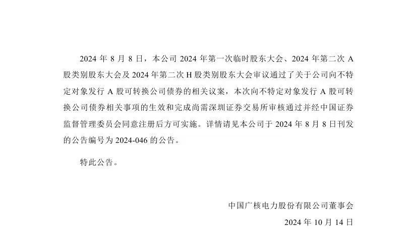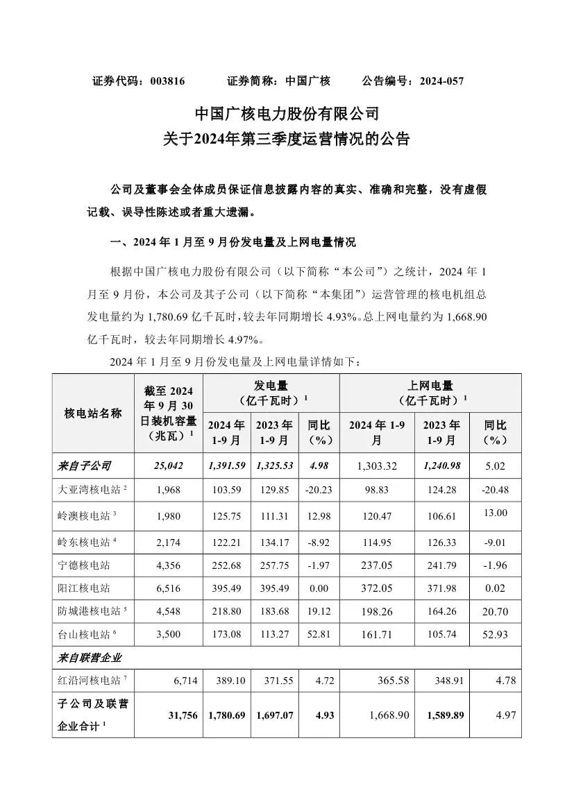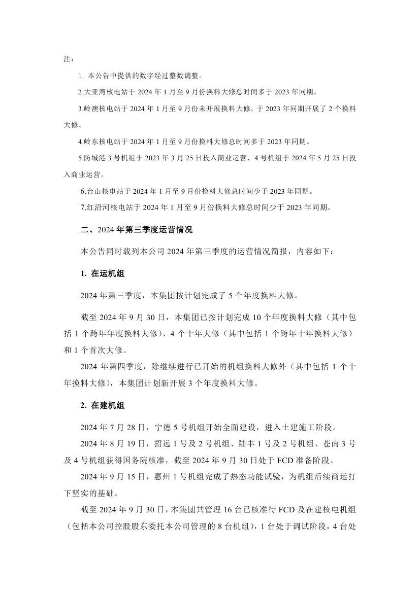 據(jù)悉,中國廣核近日披露2024年第三季度運營情況。