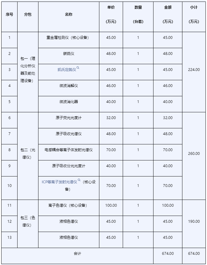 包一:理化分析儀器及前處理設(shè)備。單臺(tái)設(shè)備最高限價(jià):厭氧工作站 1(臺(tái)套)29萬元 、多功能酶標(biāo)儀1(臺(tái)套)28萬元、全自動(dòng)氨基酸分析儀1(臺(tái)套)52萬元 、超級微波化學(xué)平臺(tái)1(臺(tái)套)70萬元 、微量閉口閃點(diǎn)儀1(臺(tái)套)35萬元 、自動(dòng)電位滴定儀1(臺(tái)套)27萬元 。合計(jì)最高限價(jià):241萬元。