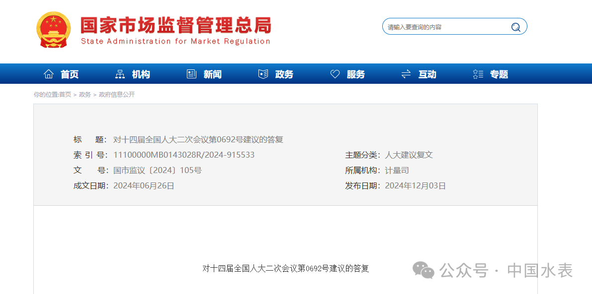 近日,人大代表李豐提出的《關(guān)于優(yōu)化智能水表檢測(cè)流程,資源節(jié)約集約利用的建議》獲市場(chǎng)監(jiān)管總局回復(fù)。市場(chǎng)監(jiān)管總局回復(fù)將積極研究探索跨區(qū)域一體化計(jì)量器具強(qiáng)制檢定制度改革,推動(dòng)區(qū)域間強(qiáng)制檢定結(jié)果互認(rèn),為“二檢合一”在更大范圍推廣奠定制度基礎(chǔ)。