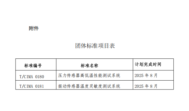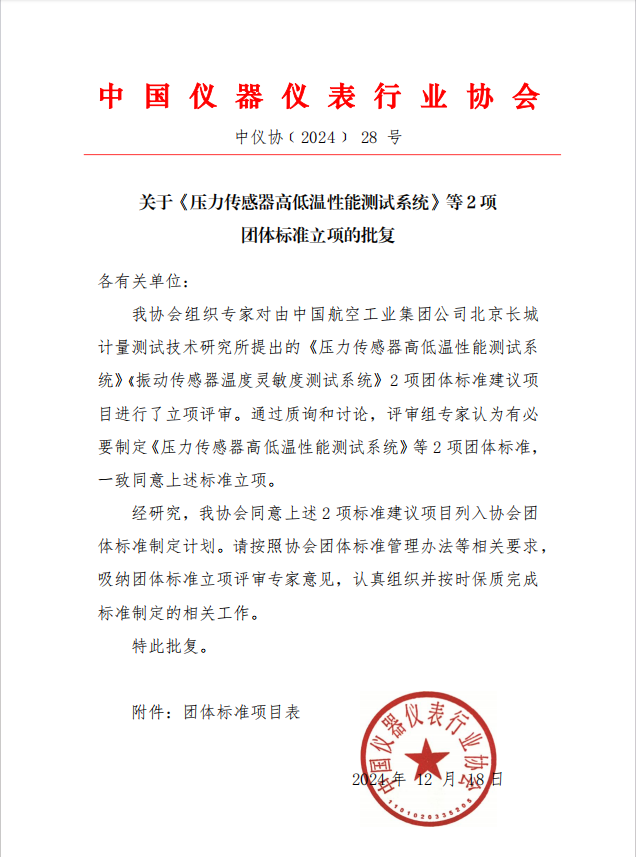 根據(jù)《中國儀器儀表行業(yè)協(xié)會(huì)團(tuán)體標(biāo)準(zhǔn)管理辦法》的規(guī)定,經(jīng)審查,對(duì)由中國航空工業(yè)集團(tuán)公司北京長(zhǎng)城計(jì)量測(cè)試技術(shù)研究所(簡(jiǎn)稱“304所”)提出的《壓力傳感器高低溫性能測(cè)試系統(tǒng)》 《振動(dòng)傳感器高低溫性能測(cè)試系統(tǒng)》2項(xiàng)團(tuán)體標(biāo)準(zhǔn)進(jìn)行立項(xiàng)(標(biāo)準(zhǔn)編號(hào)和標(biāo)準(zhǔn)名稱見公告附件),特此公告。