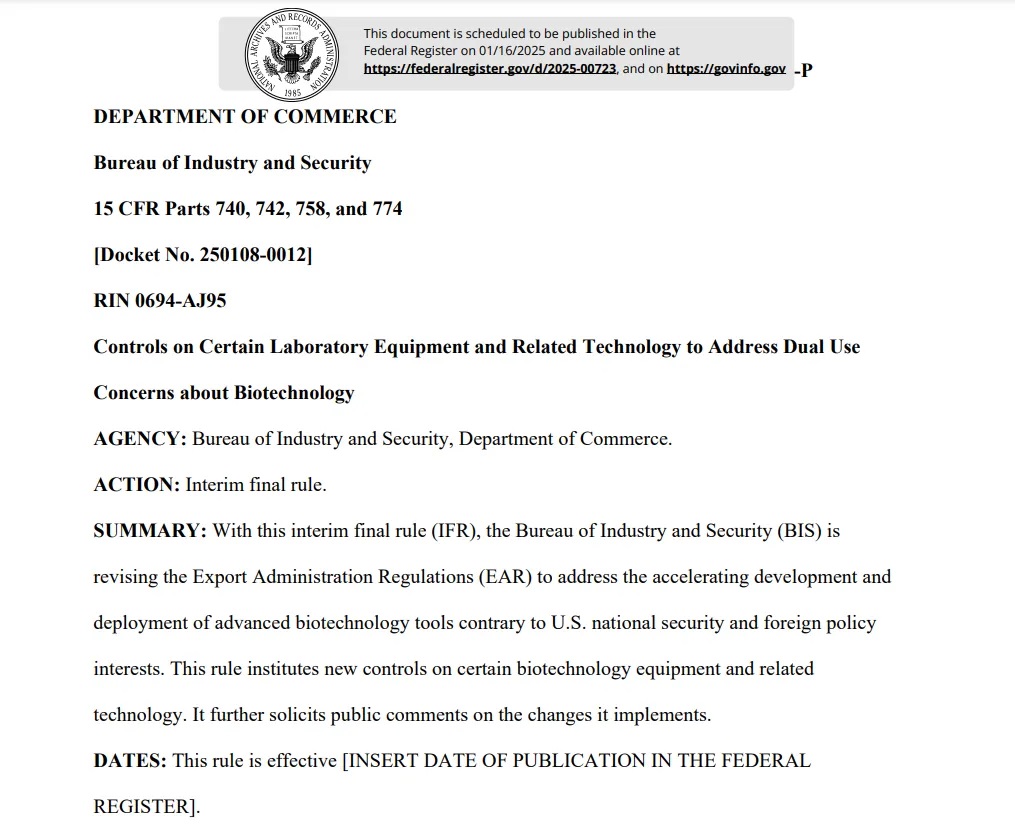 2025年1月15日,美國商務(wù)部工業(yè)與安全局(BIS)發(fā)布一項新的出口管制規(guī)定,對《出口管理條例》(EAR)進(jìn)行修訂,以應(yīng)對生物技術(shù)領(lǐng)域的“兩用性“問題。該規(guī)則對某些生物技術(shù)設(shè)備及相關(guān)技術(shù)實施了新的管控措施,并就這些變更征求公眾意見。