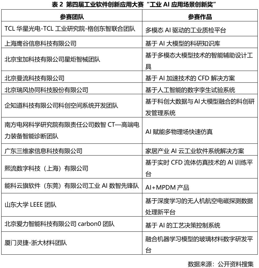 第四屆工業(yè)軟件創(chuàng)新應(yīng)用大賽以“AI+工業(yè)軟件”為主題,涌現(xiàn)出一大批優(yōu)秀的AI創(chuàng)新與應(yīng)用項(xiàng)目,有98家隊(duì)伍參與比賽,有41支隊(duì)伍入圍決賽,13支隊(duì)伍獲得技術(shù)創(chuàng)新獎,13支隊(duì)伍獲得應(yīng)用場景創(chuàng)新獎。