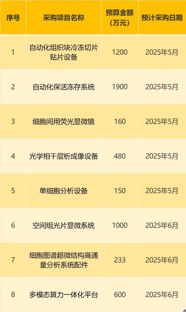 此次的采購計劃包括自動化組織塊冷凍切片貼片設(shè)備、自動化?;顑龃嫦到y(tǒng)、光學(xué)相干層析成像設(shè)備、單細胞分析設(shè)備等。這些設(shè)備主要用于組織樣品的冷凍切片、?;顑龃妗⒓毎^察與分析、三維結(jié)構(gòu)成像、單細胞轉(zhuǎn)錄組學(xué)數(shù)據(jù)獲取以及細胞超微結(jié)構(gòu)研究等方面。
