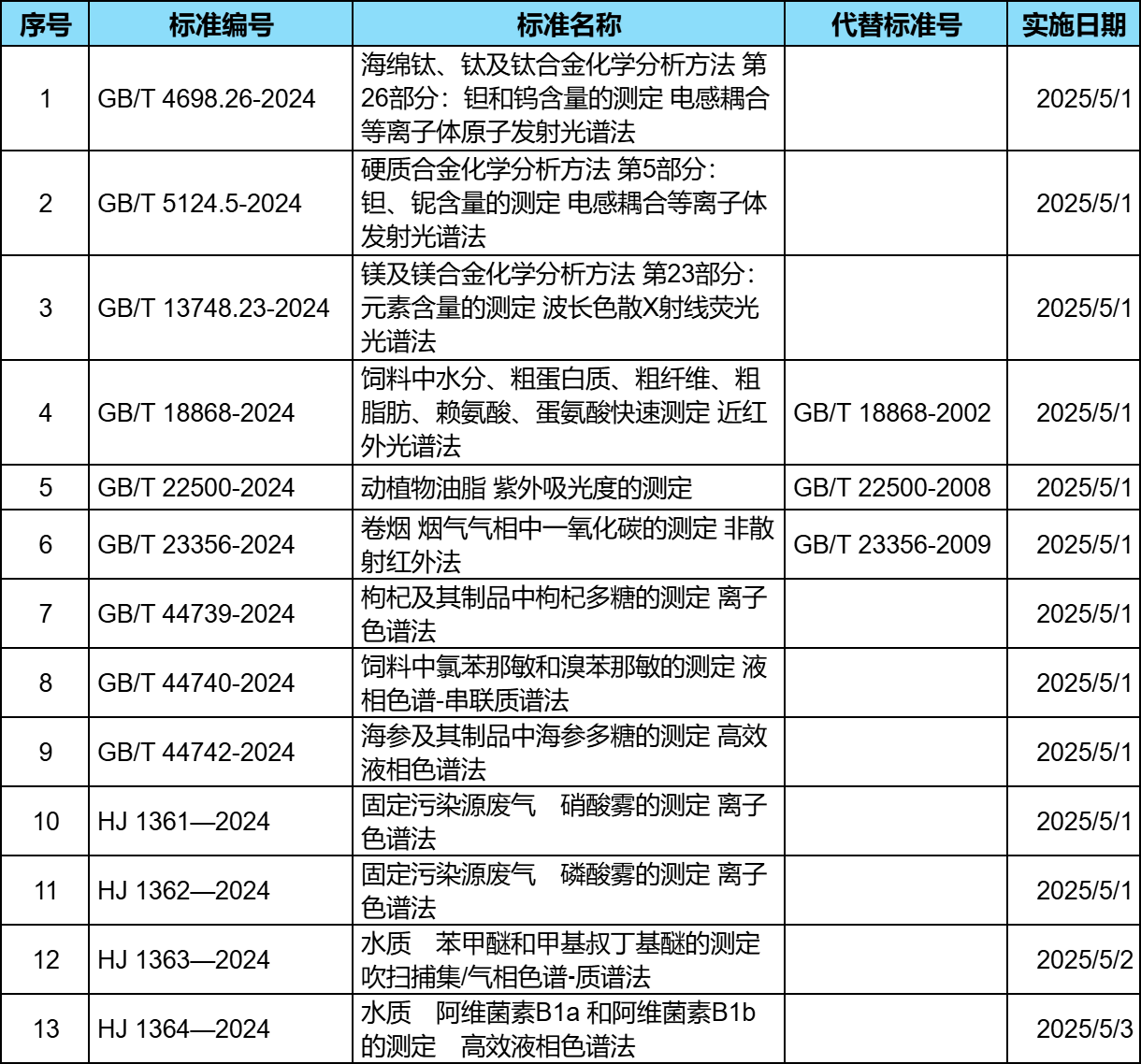 2025年5月1日,一批涉及色譜、質(zhì)譜、光譜等分析測(cè)試方法的國(guó)家標(biāo)準(zhǔn)正式實(shí)施。這些標(biāo)準(zhǔn)廣泛應(yīng)用于食品、化工、地質(zhì)、環(huán)境等個(gè)領(lǐng)域,旨在進(jìn)一步規(guī)范分析測(cè)試技術(shù),提升行業(yè)檢測(cè)能力和科學(xué)性。