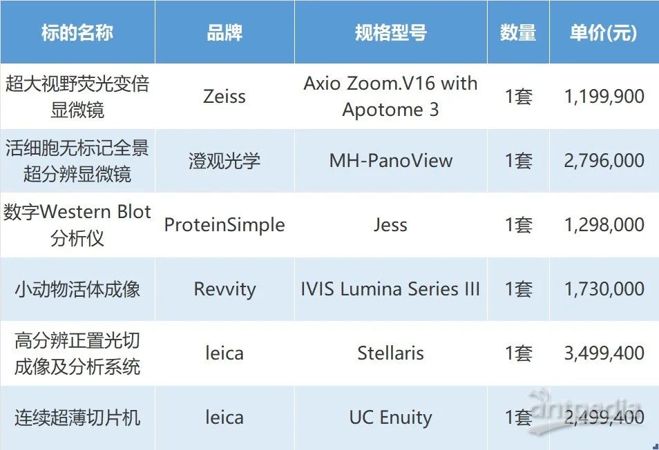 近日,中國科學(xué)院基礎(chǔ)醫(yī)學(xué)與腫瘤研究所(籌)(簡稱“中科院醫(yī)學(xué)所”)一批尖端科研設(shè)備成功中標(biāo),總中標(biāo)金額達(dá)1302.27萬元。此次中標(biāo)設(shè)備涵蓋超大視野熒光變倍顯微鏡、活細(xì)胞無標(biāo)記全景超分辨顯微鏡、數(shù)字 Western Blot 分析儀、小動(dòng)物活體成像等,品牌包括蔡司、澄觀光學(xué)、ProteinSimple、瑞孚迪和徠卡。這批設(shè)備的引入,將為研究所的研究注入強(qiáng)大動(dòng)力。