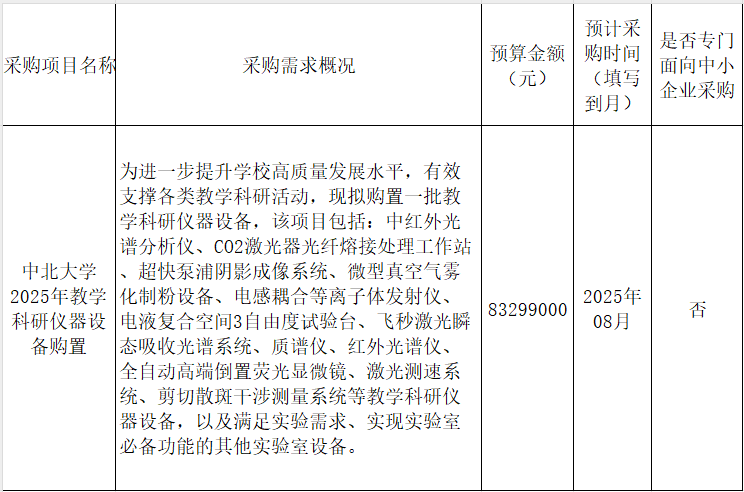為便于供應商及時了解政府采購信息,根據(jù)《財政部關于開展政府采購意向公開工作的通知》(財庫〔2020〕10號)等有關規(guī)定,現(xiàn)將中北大學2025年7月至8月第二批采購意向公開如下: