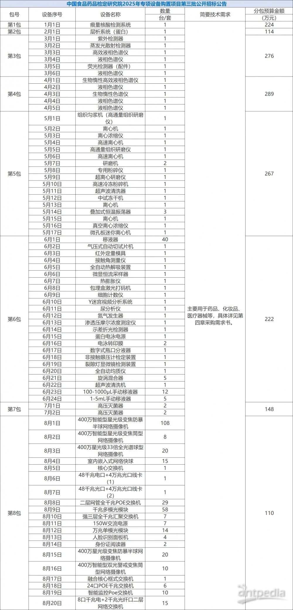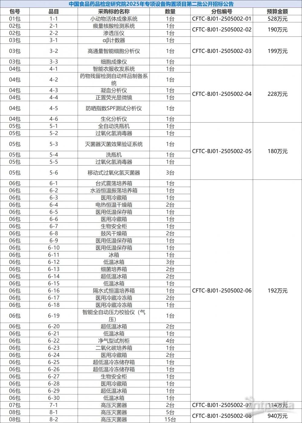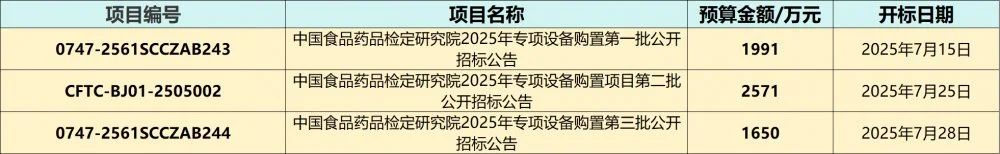 中國(guó)政府采購(gòu)網(wǎng)消息,近日,中國(guó)食品藥品檢定研究院就2025年專(zhuān)項(xiàng)設(shè)備購(gòu)置項(xiàng)目分別于6月24日和7月4日發(fā)布招標(biāo)公告,招標(biāo)總金額為6212萬(wàn)元,采購(gòu)的儀器設(shè)備共計(jì)605臺(tái)/套,包括超高效液相色譜儀、生物熒光微生物快檢系統(tǒng)、小動(dòng)物活體成像系統(tǒng)等。