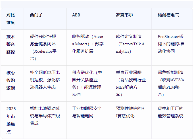ABB為例,其2024年收購Sensorfact BV的能源管理SaaS平臺,與西門子Safe Velocity安全解決方案形成直接競爭。而羅克韋爾通過收購MES廠商Plex Systems,構建了覆蓋生產執行到質量管理的閉環系統,與西門子Teamcenter PLM形成差異化。