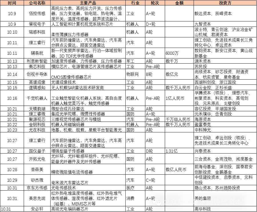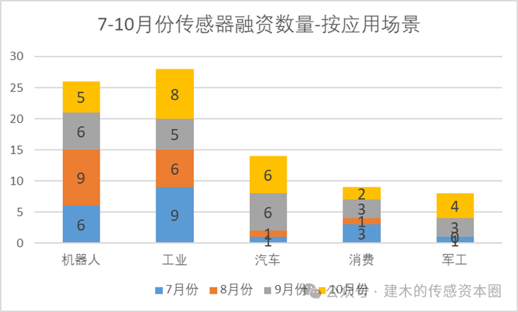 從融資企業的應用領域來看,7-10月份集中在機器人和工業領域。機器人依然是資本市場上最熱門的選擇,機器人傳感器的融資熱點主要涵蓋了六維力傳感器和觸覺傳感器兩大類。工業領域的具體應用比較雜、散,企業數量和融資案例的數量也是最多。