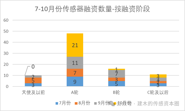 20257-10月份傳感器行業的融資數量和輪次統計如下。20257-10月共有85起融資案例,分別為20172225起融資,融資數量相對比較穩定,平均每月20起左右。