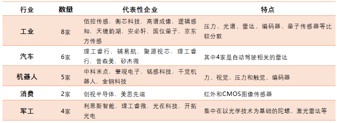工業領域的項目仍然比較分散,壓力、光譜、雷達等產品都有涉及;汽車領域應用比較集中,大部分集中在與自動駕駛相關的傳感器上;機器人不再像以前的六維力和觸覺那樣集中,投資人開始關注不同的傳感器類型了。
