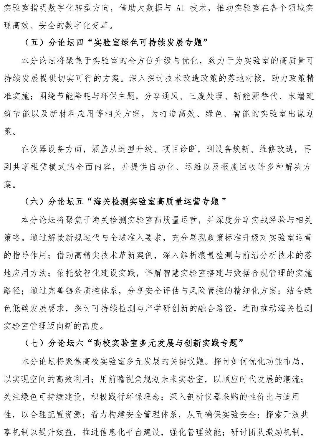 第七屆中國實驗室發(fā)展大會設置一個主論壇和八個分論壇。主論壇以“前瞻・融合・創(chuàng)新——實驗室生態(tài)發(fā)展新機遇”為主題,八個分論壇分別在實驗室綠色可持續(xù)發(fā)展、海關檢測實驗室高質(zhì)量運營、實驗室設計建設與優(yōu)化、AI賦能下的實驗室智能化與裝備自動化、高校/科研院所實驗室多元發(fā)展與創(chuàng)新、危化品管理與實驗室安全、中國實驗室數(shù)智化建設、材料測試技術與裝備創(chuàng)新應用等方面,全面深入地探討從實驗室設計規(guī)劃、建設、運維等整個生態(tài)系統(tǒng)的寶貴經(jīng)驗、見解和前沿解決方案,審視實驗室在全生命周期中面臨的挑戰(zhàn)與機遇,共同探索創(chuàng)新的理念和方案,推動實驗室的高效卓越發(fā)展。