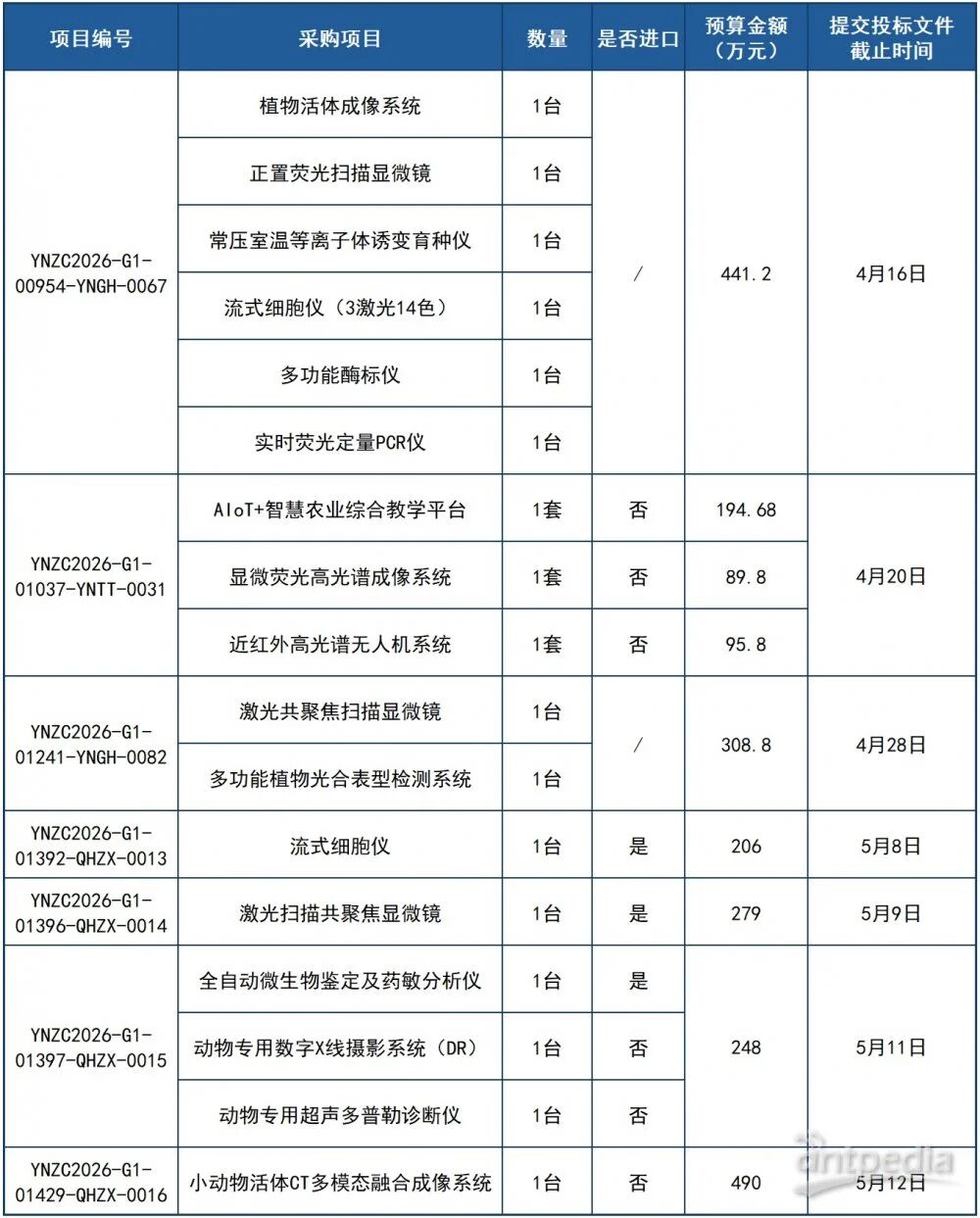 為全面提升教學科研水平,助力高水平農(nóng)業(yè)大學建設,云南農(nóng)業(yè)大學近日正式公布重大教學科研儀器設備更新招標項目,涉及園林園藝學院、理學院及動物醫(yī)學院等多個學院。本次招標涵蓋植物活體成像系統(tǒng)、激光共聚焦掃描顯微鏡、小動物活體CT多模態(tài)融合成像系統(tǒng)、等一批尖端科研設備,總預算金額超2353萬元。