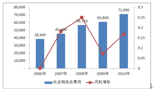 2006-2010年我國社會物流總費用由38409.48億元增長到71000.00億元,年復合增長率16.60%,物流業在我國經濟的發展中扮演起越來越重要的角色。