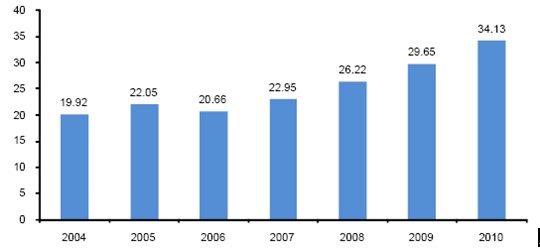 十一五”期間我國物流基礎設施的不斷建設和完善,物流業發展獲得了空前的機遇,也為物流行業在“十二五”期間繼續高速發展提供了堅實的基礎。據聚源統計,物流行業固定資產投資額從2004 年的0.67 萬億元增長到了2010 年的約3 萬億,年復合增長28%