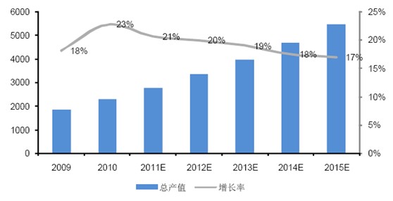 傳感器是安防設備的核心器件,未來傳感器在安防領域的市場規模增速將和安防行業的產值增速同步,預計未來5 年年均增長在20%左右。根據我國安防行業“十二五”發展規劃(審議稿),到“十二五”末期實現產業規模翻一番的總體目標,年均增長率達到20%左右,2015 年總產值達到5000 億元;而在2010 年,我國安防行業總產值達到2,300 億元,年增長率23%